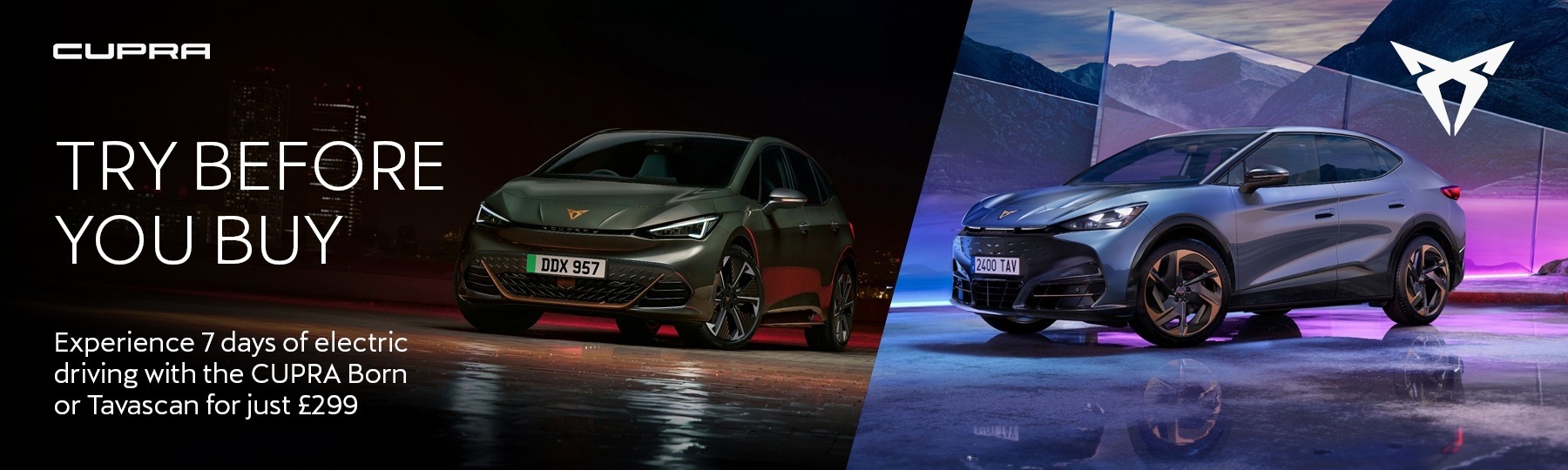 With our exclusive Try Before You Buy offer, you can take home the CUPRA Born or the New CUPRA Tavascan for a full 7-day test drive for just £299. What's more, the £299 fee is fully redeemable against the purchase of any New or Used car from Yeomans CUPRA within six months of your trial.