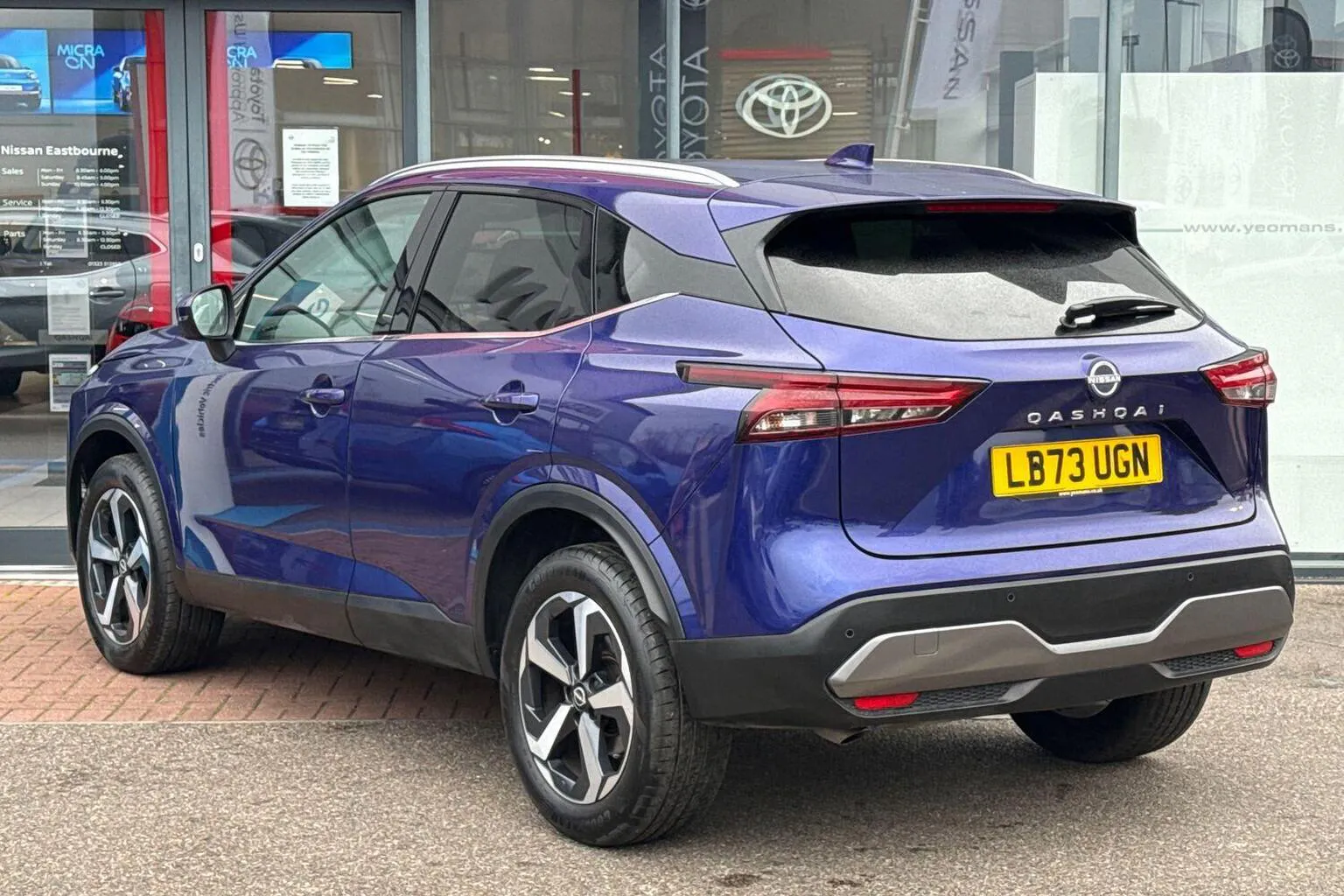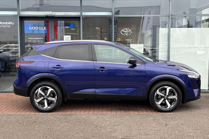 This Nissan Qashqai available from Yeomans Nissan Eastbourne has a 1.3 litre Mild Hybrid engine, 7 Speed Automatic Gearbox and finished in Blue.