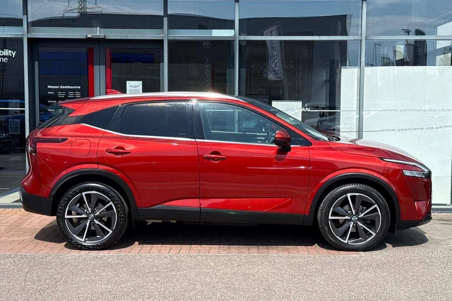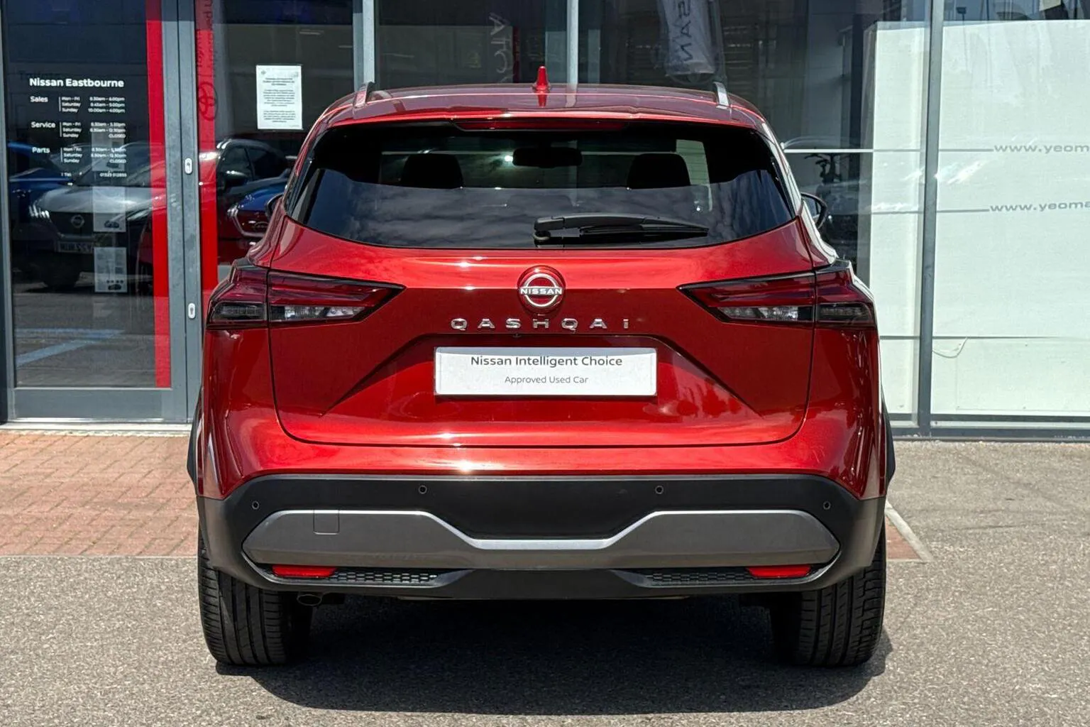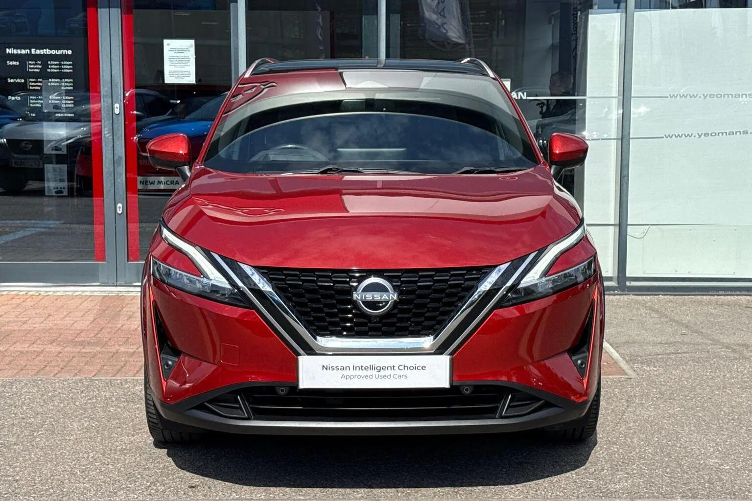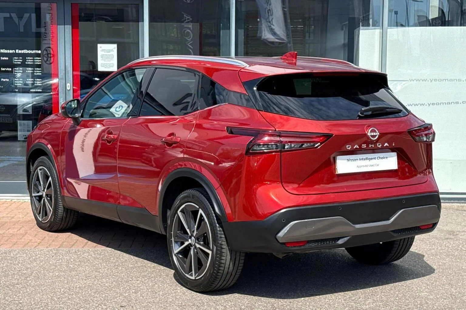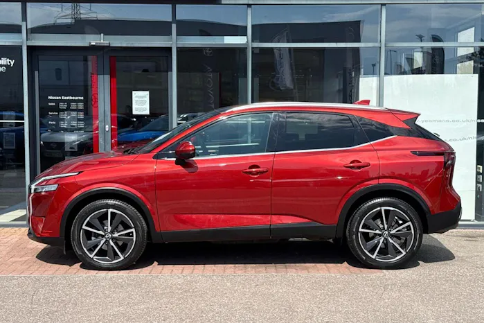 This Nissan Qashqai available from Yeomans Nissan Eastbourne has a 1.3 litre Mild Hybrid engine, 7 Speed Automatic Gearbox and finished in Red.