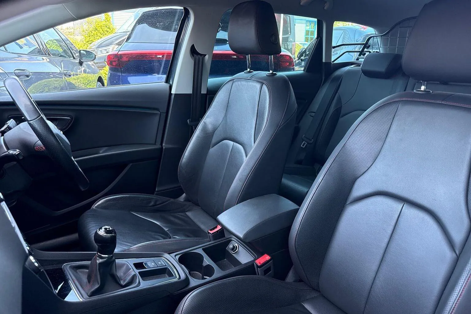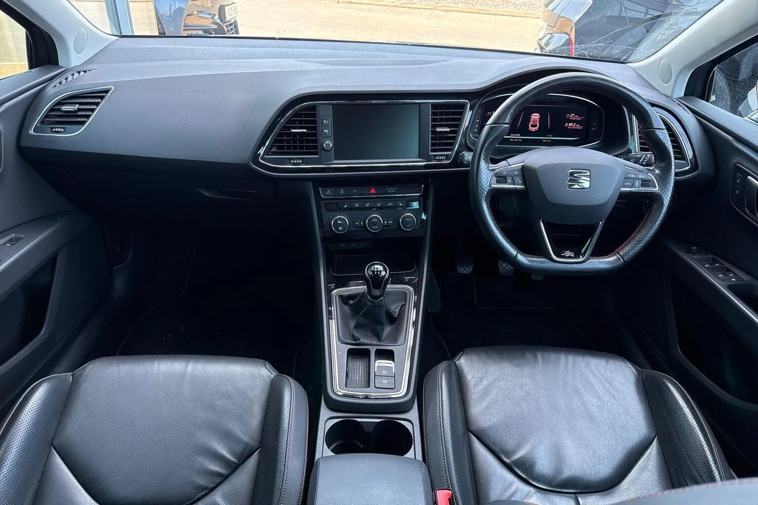 - Flat bottomed perforated leather steering wheel with red stitching and FR logo