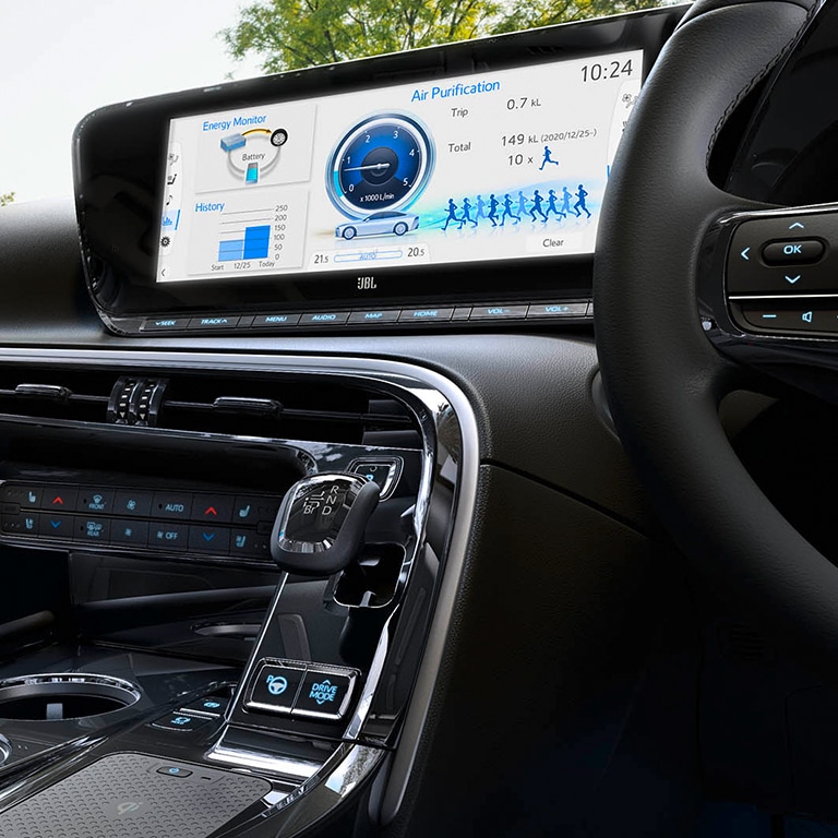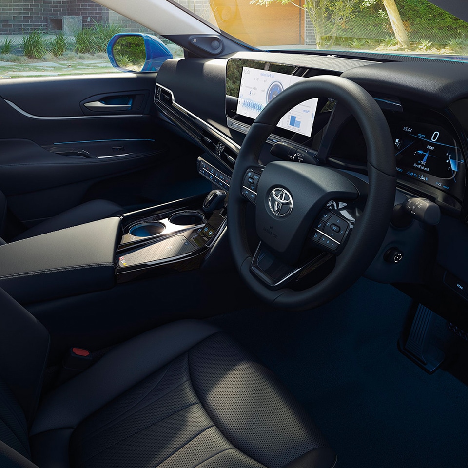 05Safety & technologyThe technology of the new Toyota Mirai’s engine may well take all the headlines, but there’s plenty more included that will add to your motoring. Take, for example, the 12.3-inch multimedia display. This is the hub of activity during your travels, syncing to your smartphone for the utmost connectivity and offering a Panoramic View Monitor for safer driving. With additional active safety measures also available, you can enjoy complete peace of mind no matter where you’re headed.