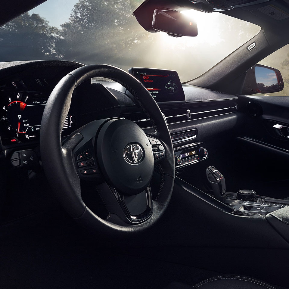 05Safety & technologyThough breathtaking performance is at the forefront of the GR Supra experience, it certainly doesn’t fall short on technology and safety. LED adaptive headlights and auto-dimming mirrors are on hand to help in dark driving conditions, while the Supra Safety + package takes things even further. This brings Blind Spot Monitor, Lane Departure Alert and Rear-end Collision Alert for an extra layer of protection. For a sense of luxury, there’s bags of appealing tech on board too. As standard, a 10-speaker audio system is equipped along with an 8.8-inch display with navigation. Upgrade to Pro, and a 12-speaker JBL sound system and a wireless smartphone charger are introduced.
